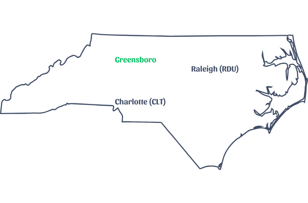 Charlotte Douglas Airport (CLT) - The Queen City airport! Be warned that if you choose this route there is always traffic coming to Greensboro because of never-ending construction to “improve the congested area."